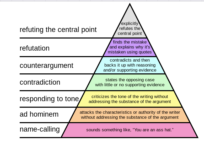 I feel that George’s article “The Cruel Fantasies of Well-Fed People” doesn’t do well when measured against Graham’s hierarchy of disagreement. George spends a lot of rhetorical huff and puff questioning Chris’s morality - trying to present Chris as a callous “well fed” ideologue leading an unnamed movement who "treats billions of people as disposable" and 'promotes what appears to be a recipe for mass starvation' or 'formula for mass death’, Chris is described by George as peddling ” the great cruelty- common to colonialism, capitalism, communism, Nazism, neoliberalism". And so another online disagreement meme becomes relevant here: namely “Godwins law” known as ‘the rule of Nazi analogies’ which states that as an online discussion grows longer (regardless of topic or scope), the probability of a comparison to Nazis increases. .Personally I feel that , Nazi name calling aside, accusing anyone of causing mass starvation is a pretty serious accusation - best kept for accusing actually powerful people: eg. the states and corporations bombing civilians, forcibly grabbing land in central Africa or inflicting crippling debt and austerity measures. Accusing a rather unknown and mild-mannered ruralist writer of clearing the way for the third horseman of the apocalypse is a pretty low blow. Coming from a journalist with a big public platform it comes off petty, defensive, even defamatory. But thats all about tone - low on the triangle.